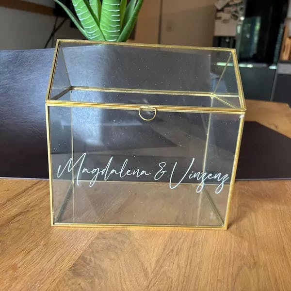 Diese hochwertige Glas-Kartenbox mit goldener Umrandung ist der elegante Mittelpunkt eurer Feier. Ob für Hochzeit, Taufe, Babyparty oder Jubiläum – sie bietet stilvollen Platz für Glückwunschkarten, Geldgeschenke oder kleine Botschaften eurer Gäste und wird zum besonderen Erinnerungsstück an diesen Tag.