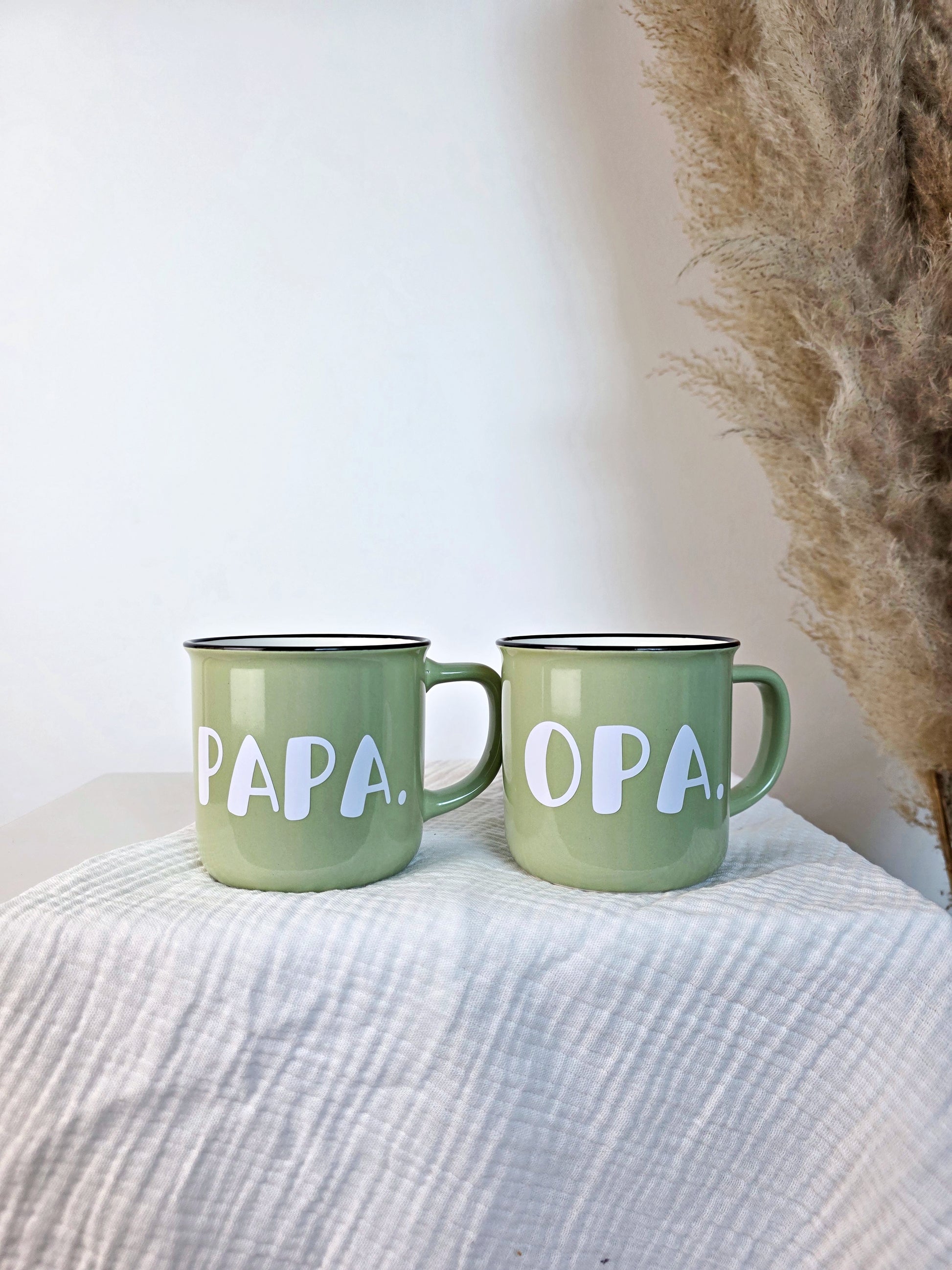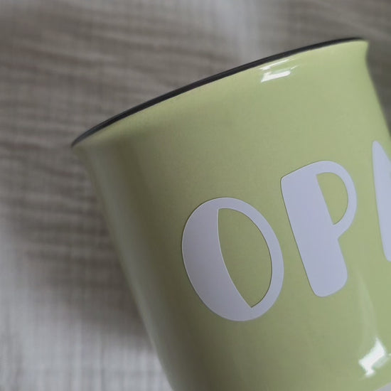 Eine personalisierte Tasse ist immer etwas ganz Besonderes. Diese grüne Kaffeetasse aus Porzellan in Emaille-Optik wird mit deinem Namen in Großbuchstaben und Punkt (z. B. OPA.) veredelt – schlicht, modern und mit einer klaren Botschaft. Die Personalisierung erfolgt mit hochwertiger Vinylfolie, die für einen eleganten Glanz und eine lange Haltbarkeit sorgt.
